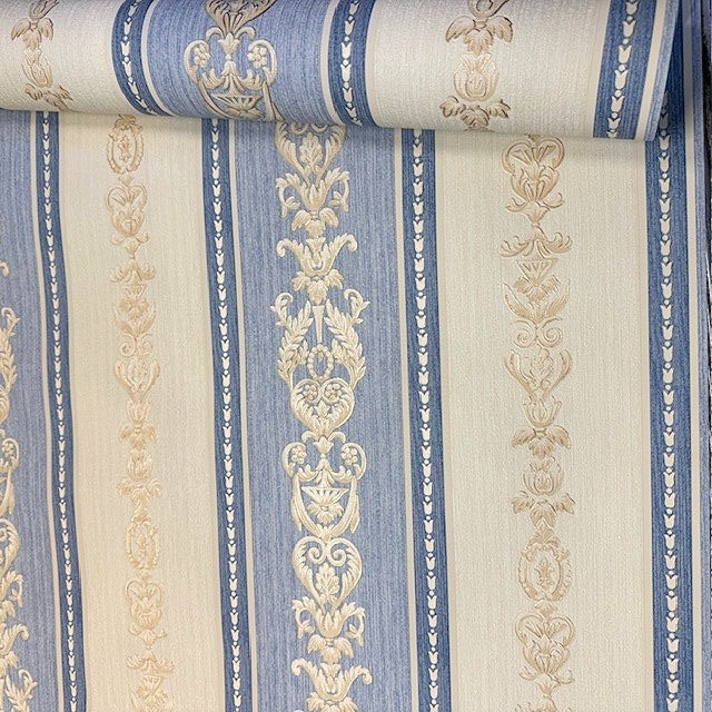 Liberty Stripe behang blauw crème – klassiek Engels strependesignKlassiek Engels Liberty Stripe vinylbehang in blauw en crème met strepen en ornament. Afneembaar, duurzaam en perfect voor een luxe landelijke of hotel chique inrichting.